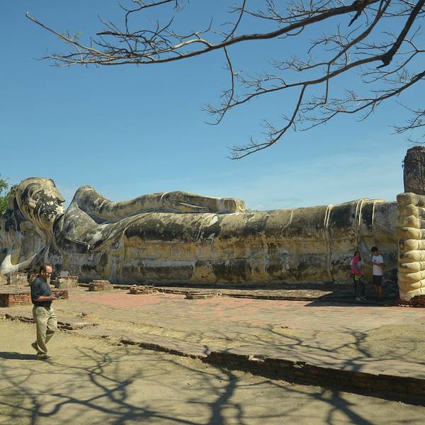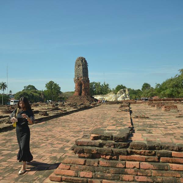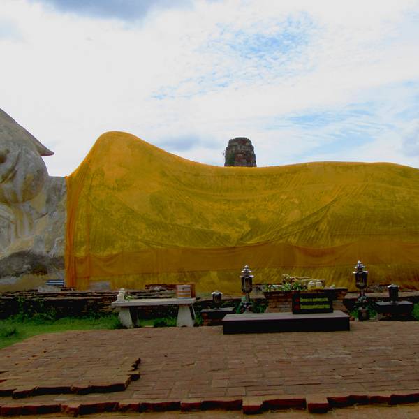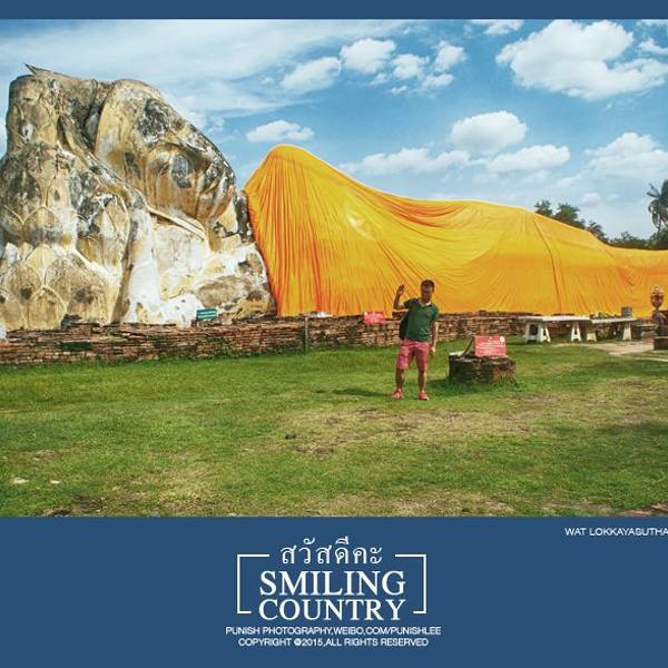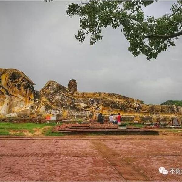 现实中的卧佛像被露天放置着,披着一身黄袍,算不得特别庄重Wat Lokayasutha应该不能称作寺,因为它除了一座塌了一半的塔和大卧佛之外,基本已是一片蔓草,没有任何建筑物的存在。