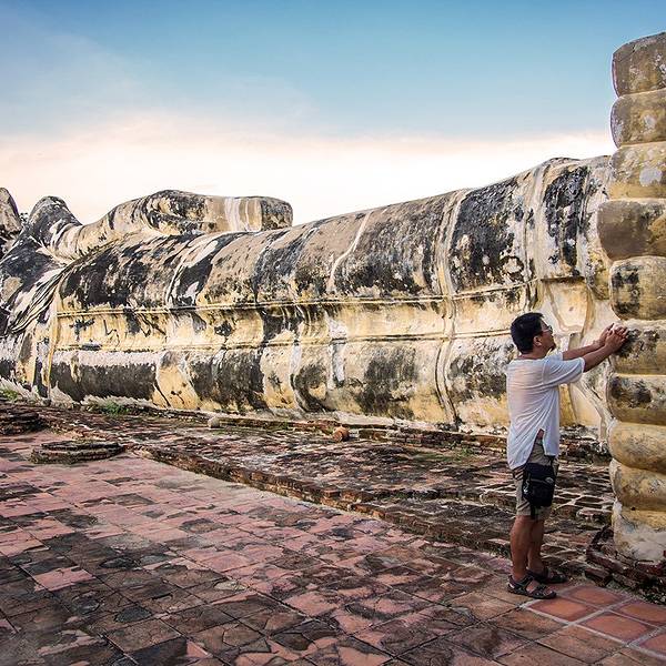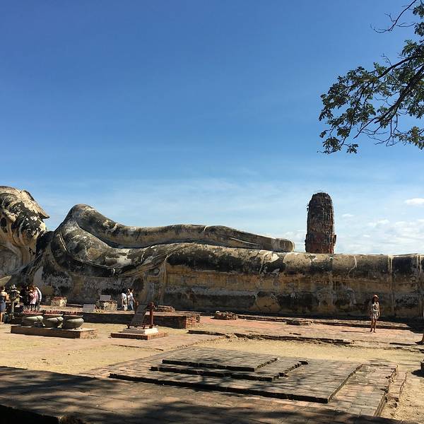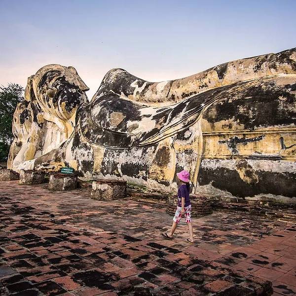 从曼谷靠山路,有很多一日游可到大城,也可以到华南篷火车站坐火车自己去,到达大城后,...看了这么多卧佛,最喜欢这樽,虽然没有华丽的庙宇,也可能历尽风雨,但有历史痕迹,卧佛静静地躺着守护着这个古老的皇城。