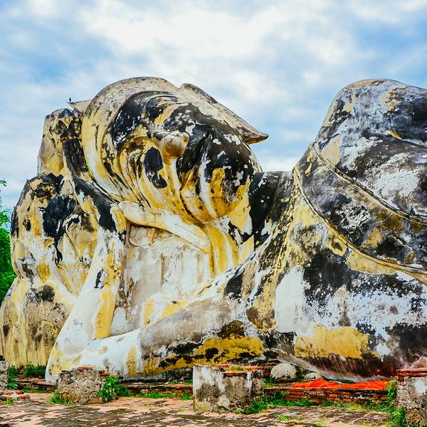 卧佛寺是大城最古老的寺庙,周围的大殿都已损毁,只留下大佛侧卧于天地之间。