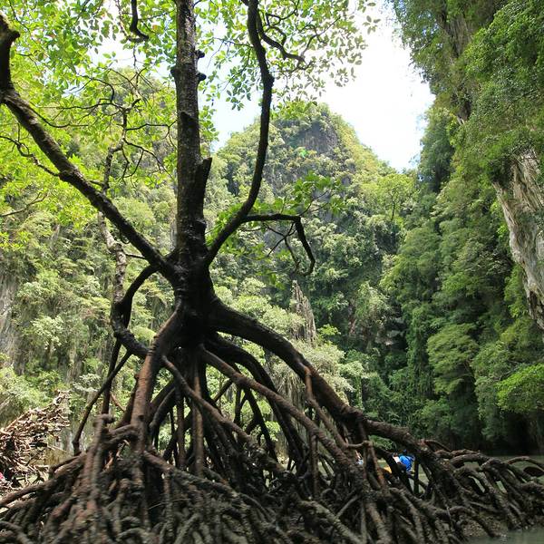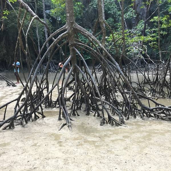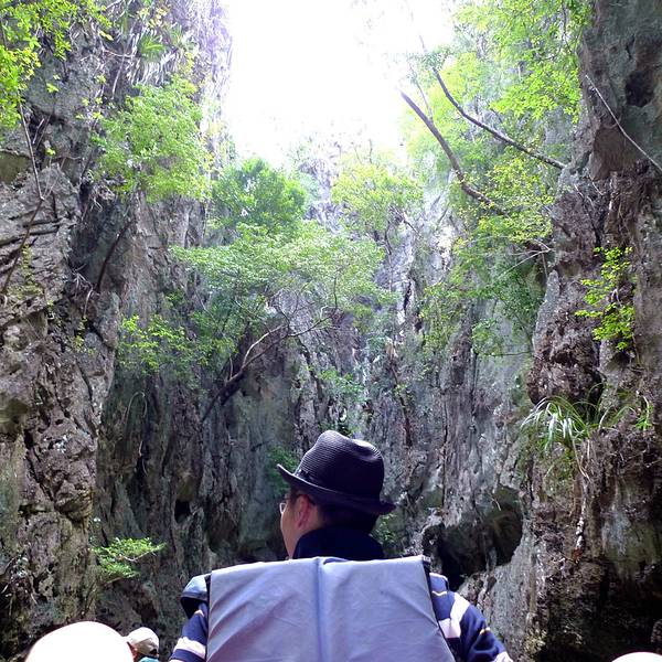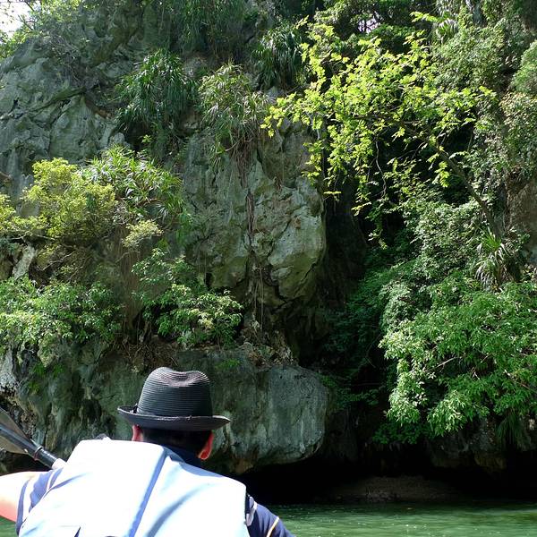 驾驶大约2小时以后,会到达湖中央,然后换乘皮划艇,两人一个,进入岩洞内部,然后到达红树林的里,仿佛像是进入世外桃源一般。树木与植被相当多样,然后泰国小哥还会用树叶制作很多形状,可供拍照。