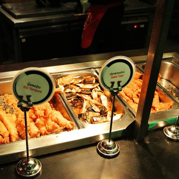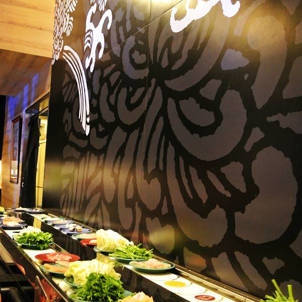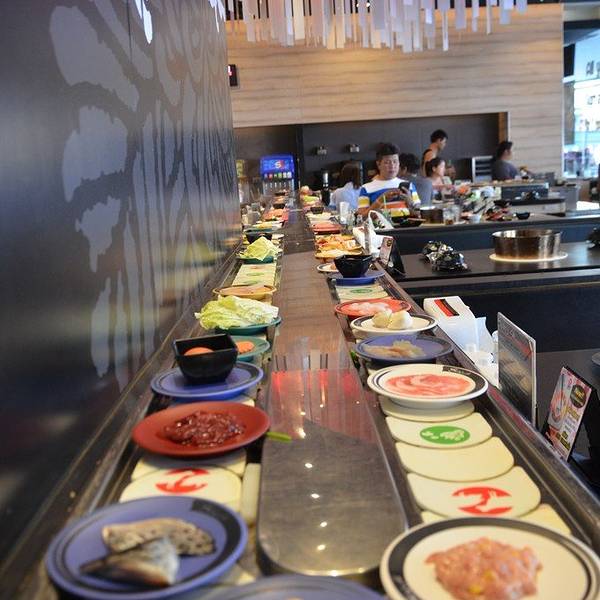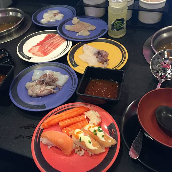这家餐厅吃的是日式自助回转涮涮锅+日式料理自助餐,345B/人,限时1小时15分钟要吃完埋单,涮涮锅的料和自助餐区都很丰富,雪糕和饮料不限量,性价比非常高哦! 【涮涮锅】是一人一个小锅,汤底有鸡汤、冬荫功汤和牛奶汤可以选择。打锅的配料不是服务员端上来的,像吃回转寿司一样,打锅的料会放在传送带上不停转,客人自己随意拿。传送带上的食物有鱼、虾、肉、海鲜、蔬菜等都齐全,我个人个别推荐大虾,弹牙好吃!最可爱的是,打锅料理有一种料很特别,是愤怒的小鸟造型,因为可爱所以很抢手哦,每次放出来就很快被拿光,好不容易拿到一碟,原来是面粉做的。【自助餐BAR】除了打锅,还有些寿司、天妇罗、关东煮、冰淇淋、饮料和水果等是放在边上的自助区的,冰淇淋都是雀巢的,不限量。 另外,这里也有刺身吃哦,不过需额外点,79B一碟。