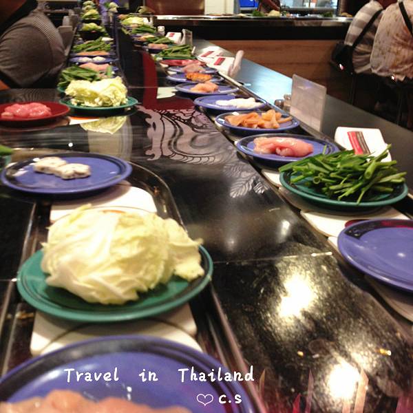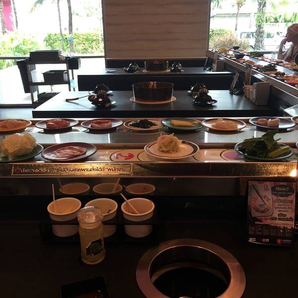 出了超市我们看到了SHABUSHI,在清迈有个女生说比起千人火锅更推荐我们去吃SHABUSHI,这家更干净菜品更新鲜。我们实在不知道吃什么就决定吃这家,它有三种锅,分别是牛奶锅、鸡汤锅、冬阴功汤锅。我选择了冬阴功汤...出了超市我们看到了SHABUSHI,在清迈有个女生说比起千人火锅更推荐我们去吃SHABUSHI,这家更干净菜品更新鲜。我们实在不知道吃什么就决定吃这家,它有三种锅,分别是牛奶锅、鸡汤锅、冬阴功汤锅。我选择了冬阴功汤,小莎选择了鸡汤。蘸水就是有些像四川豆瓣酱的味道,不过有点点甜味。可以接受。我加了些小米椒和香菜进去味道更好一些。菜品就是在你面前一直旋转,想吃什么菜直接拿下来就是。另外还有寿司水果饮料冰淇淋随便吃。345B/人,很划算。我看到冰淇淋都是雀巢的,巧克力味的里面还有真的巧克力。超级好吃。我们去的时间比较晚,吃到最后只剩下我们和另外两个人了。这个时候服务员们还是收拾了。我以为她们把菜收了会明天继续给客人使用。结果太震惊的是我们看到服务员把旋转带上的菜全部倒进了一个黑色的垃圾口袋。不管是虾还是鱼肉猪肉牛肉,统统都倒进了垃圾袋,还有工作人员把今天喝剩了的饮料也全部倒进了垃圾桶,我实在太震惊了,一直和小莎感叹这一顿太值了,吃的放心啊。