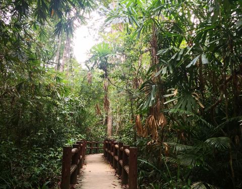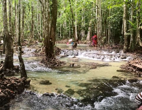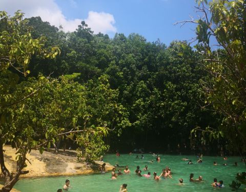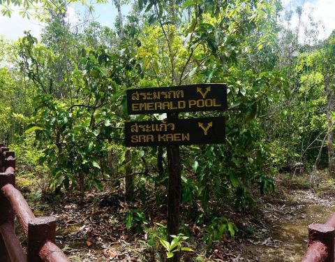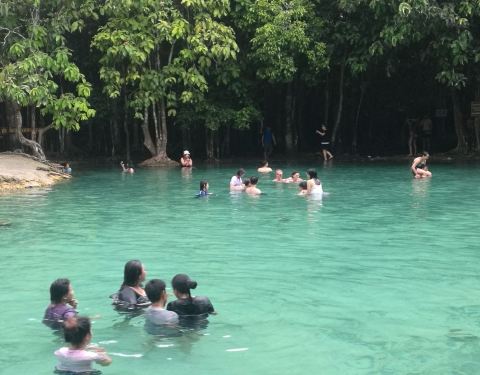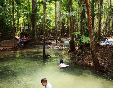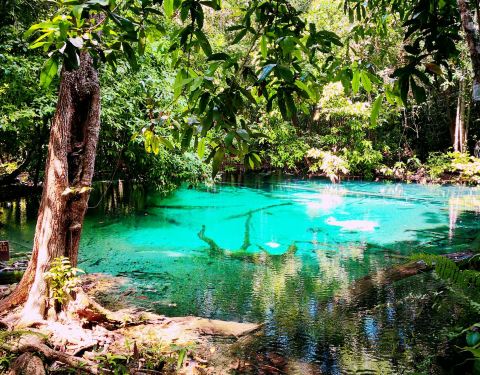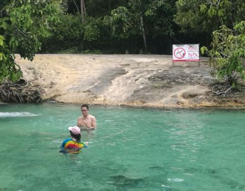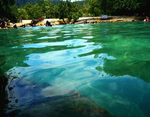 翡翠池位于国家森林公园内,这个公园是一处未经开发的热带雨林,这里植物繁茂并栖息着大量稀有的野生动物。 翡翠池湖水呈浅绿色,水温接近人体体温,是非常舒适的天然泳池。水流从缓坡流下,聚集在低洼处,湖水不深,大人站立湖中水位及胸。顺着天然小路继续前行,还可以抵达另外一处水质更加清澈的蓝湖,但是由于湖底比看起来要深得多,底部淤泥会使人陷进去,所以这里禁止游泳。