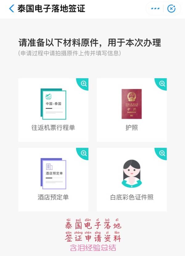 zfb搜索🔍「泰国落地电子签证」而后进入页面,申请之前您需要准备以下材料原件方便办理:①往返机票行程单 ②护照 ③酒店预定单 ④白底彩色证件照