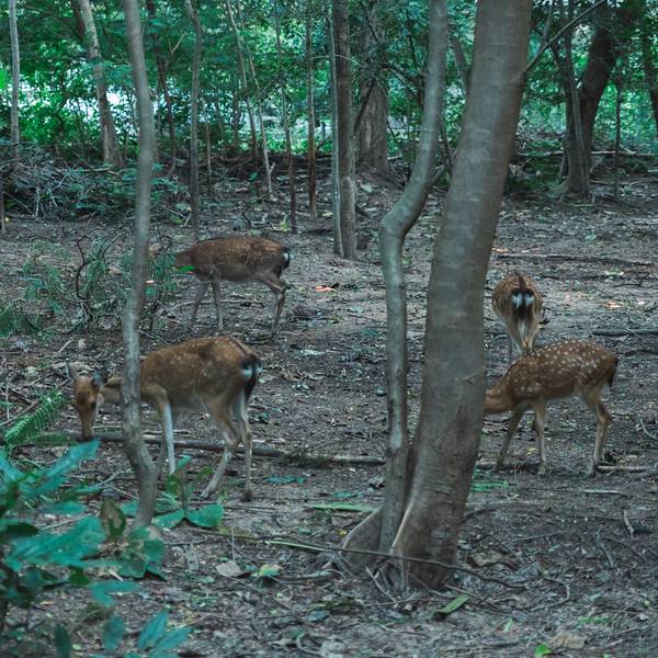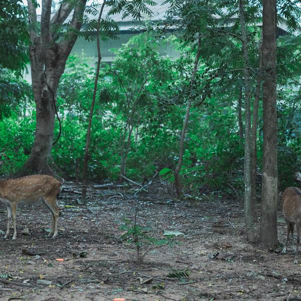 是为了来看动物园门口散养的小鹿啊!自从上次去奈良看了小鹿,虽然它们追着我咬我的屁股,但我还是觉得它们很可爱,所以听说这里有小鹿后,就兴冲冲的来了。其次是清迈夜间动物园很多都是动物的表演,不想看到动物们被驯化后乖巧的样子,特别是大象们,所以也不想去观赏动物表演。和小鹿的奇妙缘分就在于,每次看小鹿,都会碰上下雨天。今天可能是我们来晚了或者是天气不好,没有在草地上看到小鹿。可是我不死心,继续在树林中寻找,终于找到了4只正在吃胡萝卜的小鹿。