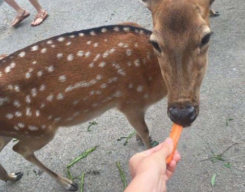 这里的小鹿不像奈良,个个胆子都很小,我轻轻靠近一步,它们就跑远两大步。我从地上拾起一根胡萝卜吸引它们,它们用慌张的眼神看着我,我只好放弃了与它们互动。Tips: