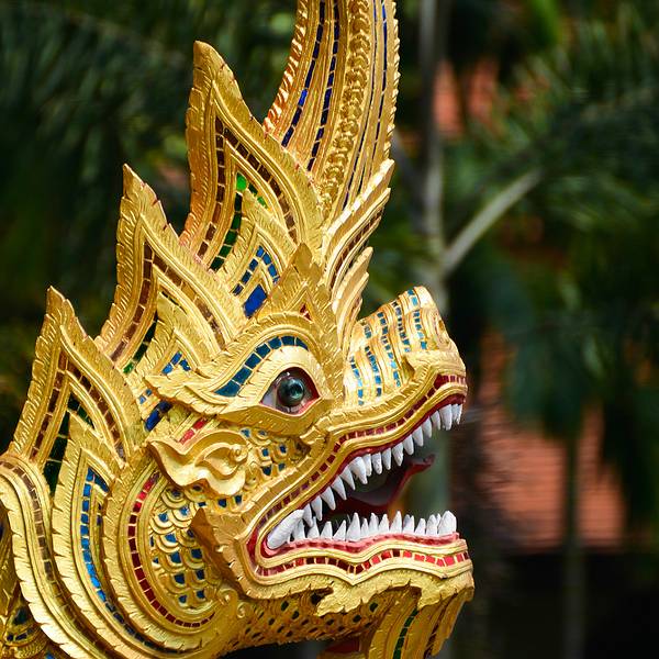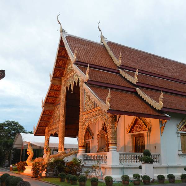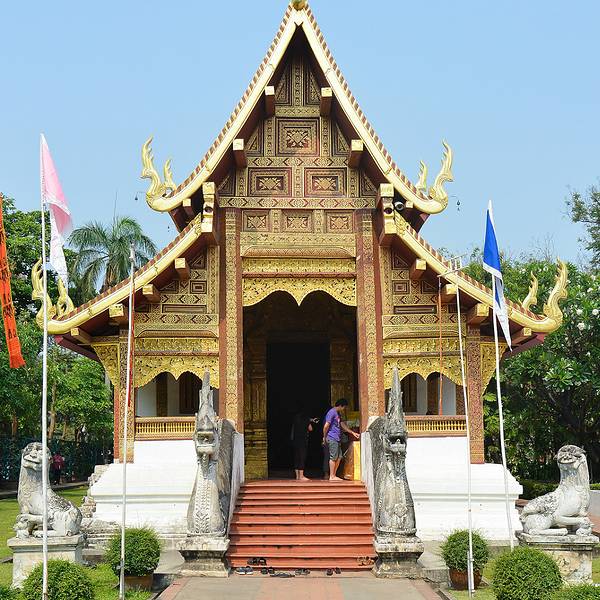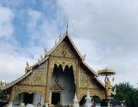 帕辛寺是清迈地位较高、同时也是很大的一间寺庙,与双龙寺、契迪龙寺并称为“清迈三大寺庙”。这座寺庙是帕于王为纪念其父亲而建于1345年,后多次扩建,因供奉着令人敬畏的帕辛佛像而出名。 金碧辉煌的寺庙 寺中装饰金碧辉煌,有工艺精湛的木雕、关于佛教故事的壁画,细腻精致、栩栩如生,值得好好观赏。 帕辛寺内树木葱郁,鲜花盛开,环境十分优雅。这里香火很旺,游客众多,如果早晚课时前往会看到僧人在佛堂吟诵经文,十分虔诚。 寺庙正门口有一左一右两只白色的神兽雕像,走进去会看到一个圆形花坛,中间是一座金色的人物雕像。花坛后面是长长的正殿,尖尖的三角形屋顶两侧有多条金龙,外墙上的雕花也金灿灿的,显得精美华丽。
