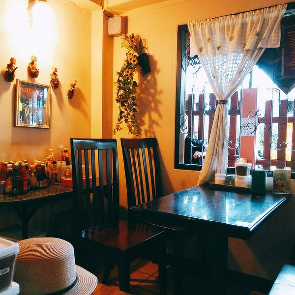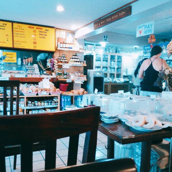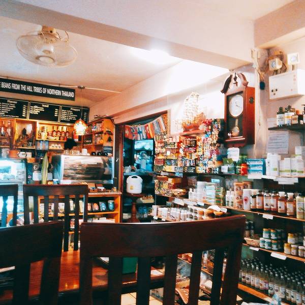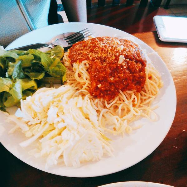 忘记拍它的门头,只能网上找来一张,水印不要在意~不要在意~里边的桌上放着各种番茄酱辣椒酱芥末酱随便自己加~店里还兼卖着手工皂之类的东西和烤好的面包点心,我们翻了翻菜单,谨慎选择了各自一份主食和一份鸡块。等待食物上桌中~先上来的咖啡和果汁~以为已经够谨慎点菜了,结果主食端上,又是好大的一盘哈哈哈……美式的分量为啥和泰式分量差这么多??鸡块挺好吃的,看颜色还以为是鱼肉呢,不过确实是鸡肉~熊点的超级大分量的肉酱意大利面,感觉分给四人吃都可以的量。艰难开吃,味道都还不错,虽然吃完东西已经到了嗓子眼。看看我们现在的位置离松撇市场不远,就说去那里散散步消化一下,顺便熊还得帮她舅舅再买一点奶片回去。