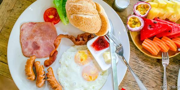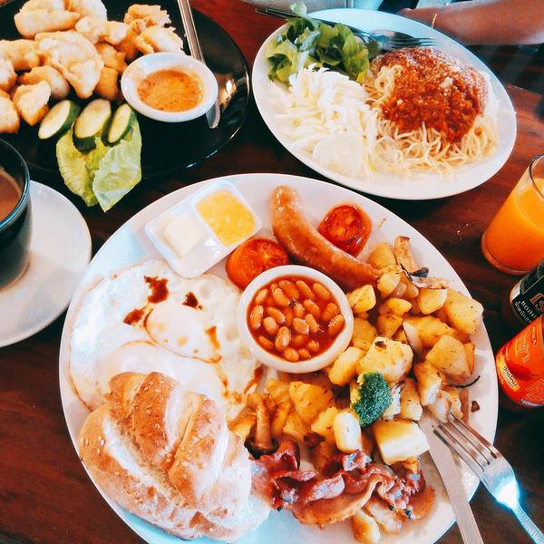 这家早餐店叫blue diamond, 来这里的人挺多的,因为这个早餐店种类多。 有面包、蛋糕、泰式的面、沙拉、pizza等等。出了点心,其他能想到的都有🤙🏻🤙🏻🤙🏻他们家的面包都是自己做的点了这两份早餐,吃早餐的时候已经10点了,相当于国内的10点,那个饿啊,几分钟就把这两碗货KO了