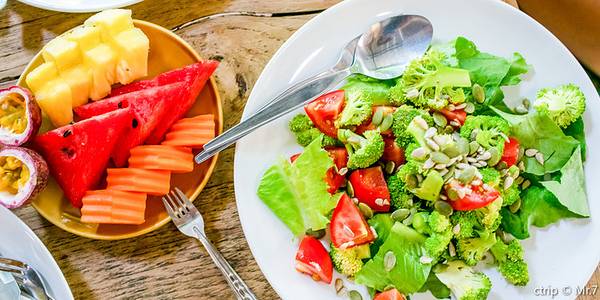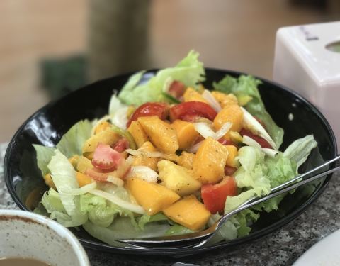 - 青菜和芒果沙拉超級好吃!一邊吃早餐一邊享受陽光一邊看著院子樹上的落葉!果汁很好喝