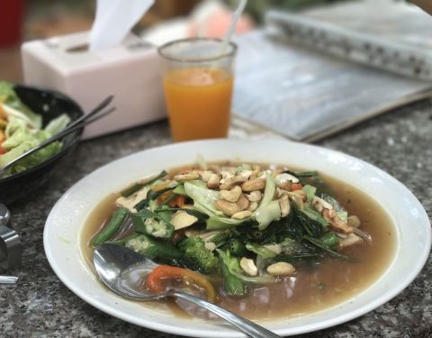 第一次发现原来蔬果餐也可以做的这么的好吃,芒果汁虽说大家都推荐,但是个人觉得放的果肉太多,打的太厚了,反而不如稍微多掺点水。青木瓜色拉作为泰国标准菜,无可挑剔,木瓜嫩滑又甜到极致,搭配的蔬菜色拉爽...第一次发现原来蔬果餐也可以做的这么的好吃,芒果汁虽说大家都推荐,但是个人觉得放的果肉太多,打的太厚了,反而不如稍微多掺点水。青木瓜色拉作为泰国标准菜,无可挑剔,木瓜嫩滑又甜到极致,搭配的蔬菜色拉爽口,棒棒哒!