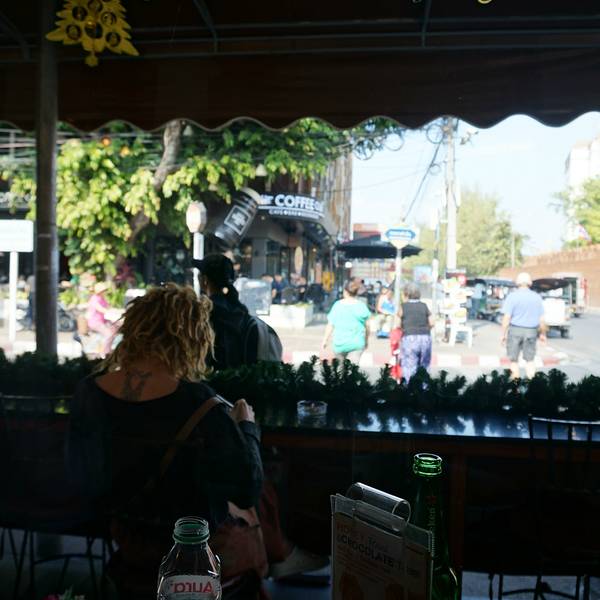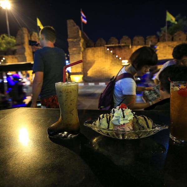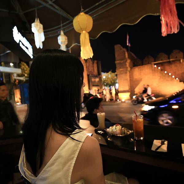 晚饭后我们决定去Black Canyon Coffee坐坐,就是吃早餐的那一家,M酒店隔壁,正对着塔佩门,店面外有一圈座椅,可以边喝咖啡边看塔佩门来来往往的人群!