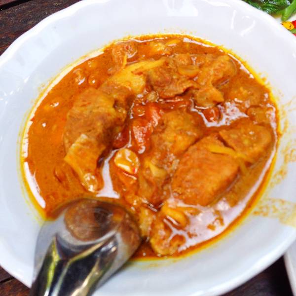 当地的蔬菜,不知名,非常好吃,叫了两碟。咖喱香茅牛肉汤,汤辣辣的,但牛肉不辣,很好吃!味道挺不错的