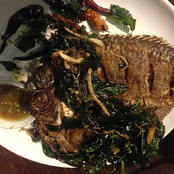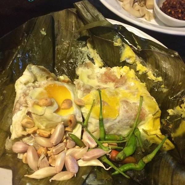 虽然我们点的菜看着些许失败,不过这里真的是正宗的泰北菜餐厅........ 但除了第一道鸡肉以外,可能我们都没想到自己点的菜 上来以后是这个样子的。这道菜全名我已经不记得了,不过当时我看到banana leaf,我觉得应该会有特色于是就点了,果然看着太特色了,佐料好像完全就是扔在上面的样子,泰国人做饭大多都用小蒜头,她们不会剥蒜去皮,即使切碎的话也会连皮一起 然后下锅翻炒。