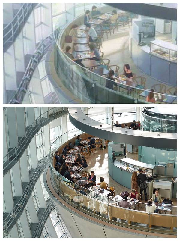 东京这一路上还挺幸运的,不少原本有很多人排队的地方,我们去的时候,都没什么人。之前看软软冰po《你的名字。》巡礼短片的时候,国立新美术馆的这家咖啡厅人特别多,而我们到达这儿的时候,也许是时间比较迟的缘故,客人并不多。看到剧中主人公的位子空着,小小开心了一下,马上在这位子坐下。