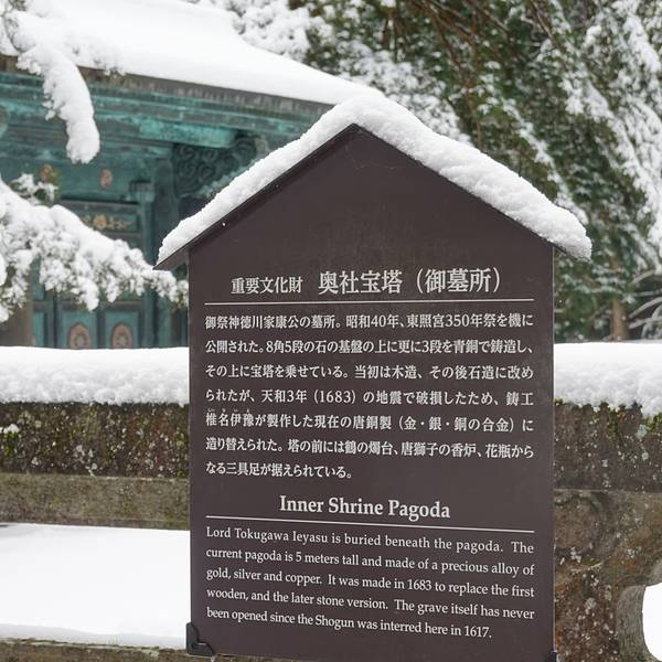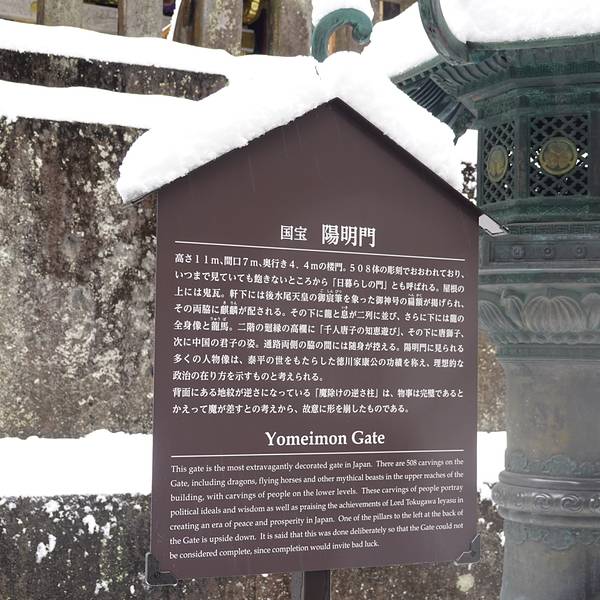 日光东照宫是一座位于日本栃木县日光市山内,始建于元和三年(1617年)的神社,属于德川家灵庙之一,主要祭祀的是江户幕府第一代征夷大将军德川家康公,另外相殿也配祀太阁丰臣秀吉公,以及 镰仓 幕府第一代将军源赖朝卿。东照宫旁还有轮王寺以及日光二荒山神社,并称为“二社一寺”。表参道入口碑入口鸟居三猿因为太可爱就都拍下来免费留念的地方下雪增加了几分美感。震撼归震撼,我为数不多的国内的寺庙观光经历觉得,中国的可能更超绝。