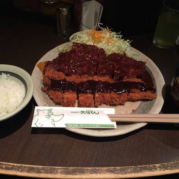 娅巴桐猪排店,yabaton,中文正规翻译是“矢场町猪排”,和日本传统的炸猪排不同,当我放出这家美食的照片,你就应该很快的辨识出他家属于偏重口味的餐厅。炸的金黄的猪排,分量很大一份,配上米饭、味噌汤,还有浇满黄豆酱的调料,单吃猪排一定会很咸的,我也从这家餐厅吃后,才有意识“原来日本人也不都是轻口美食派”,食物非常下饭,也蛮有特色的,推荐大家尝试。 银座这家矢场町炸猪排位于日比谷线东银座A8出口,在地下一层并不临街,本身这一区都是美食层,所以还是很好寻觅。毕竟是东京,物价还是略高的。这里一份定食(含米饭、汤)的炸猪排价格约75起价,根据分量不同还有上百的,人均消费大约90元上下,在快餐里价格中等偏上。