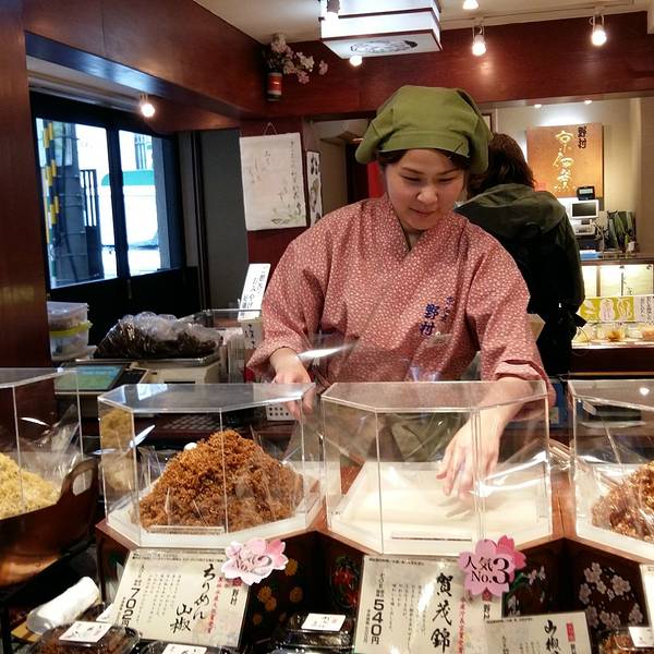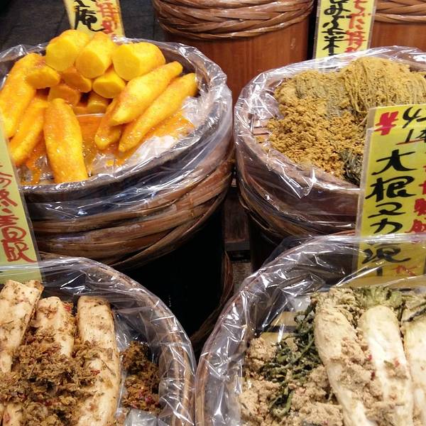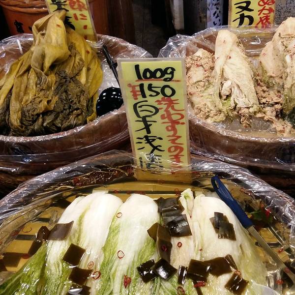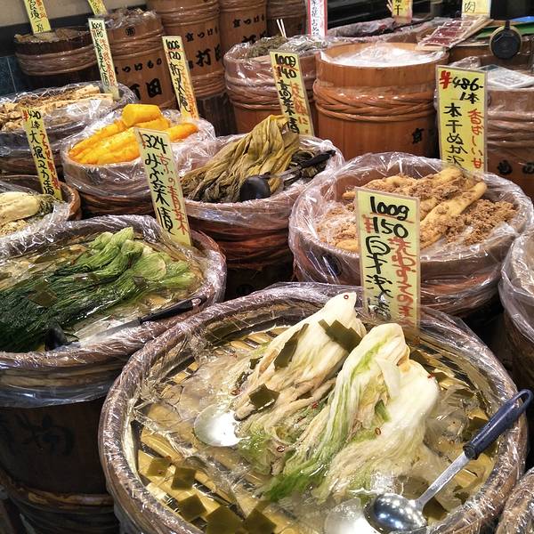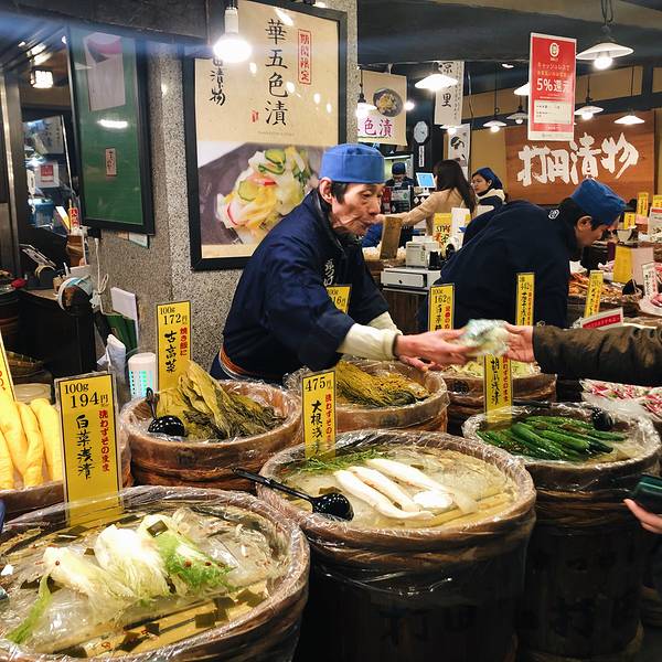 锦市场早在1311年就开设了第一家专卖店(鱼店),到了江户时代,成为繁荣一时的鱼市场,后来逐渐发展成为京都人采购各类食材的最为传统的大市场。如今,在锦市场不到400米的狭长街道上分布着近130家商店和铺位,从京野菜、酱菜、佃煮、鸡蛋卷、京果子到海鲜、肉类、烤物、章鱼烧,无所不包。