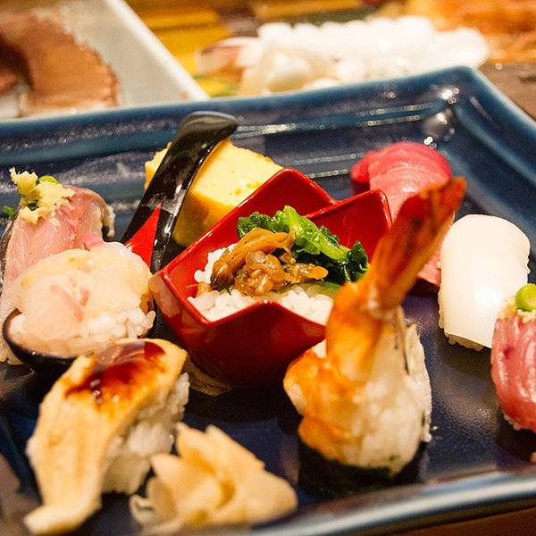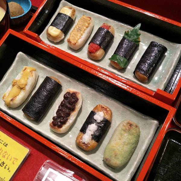 只能说,来日本了,我们真的是外国人看啥都好吃吧,去了果子的店和寿司的店,都好好吃,觉得好没有底线啊,怎么都觉得好吃。一家连椅子都没有的寿司店,站着吃了当天的主厨拼盘,新鲜、柔软,不爱吃寿司的老公,也跟着凑了热闹。藏在锦市场里的锦天满宫