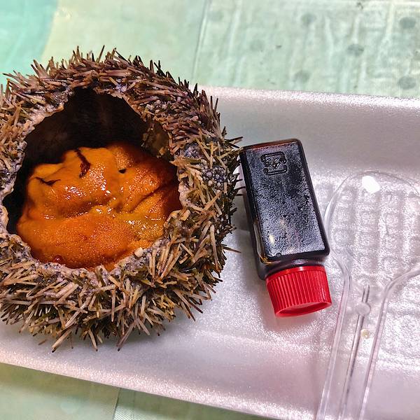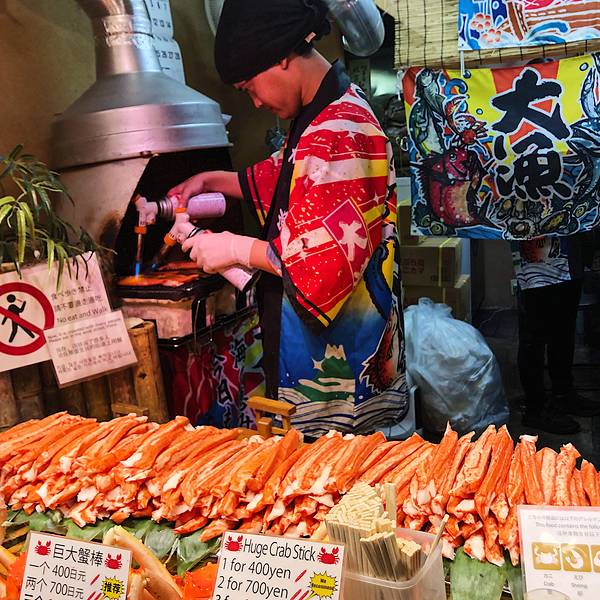 锦市场是很有市井气的批发市场,主打各种鱼生、烤肉、蔬果和熟食。摊位干净整洁,完全没有脏乱的迹象。很多摊主都是上了年纪的夫妇,互相扶持,又亲切待客,每一份美食都能感受到摊主满满的心意,日本的匠人精神说的大致如此吧。我们选了几家小摊位尝尝鲜,最最最给我心门一击的是扇贝刺身!不得不说扇贝爱好者的福音可能就在这锦市场了!厚厚的贝柱被处理的很干净,先不要蘸任何的调味料,就静静的享受一口咬下去那一瞬间的美味吧。贝柱鲜美脆嫩,入口微甜,咀嚼生鲜,完全感受不到任何生鲜的不适,此时此刻佐一点点的酱油,咸味更好的突出了扇贝的鲜美,再渐进一点山葵,是一种味蕾平衡到无法描述的绝佳风味。北海道的海胆也毫不逊色,轻轻的用舌尖一抿,每一粒的鲜美就在唇齿间化开了,如果你不爱吃生,不妨来锦市场看看,或许你会觉得之前的你可能错了。