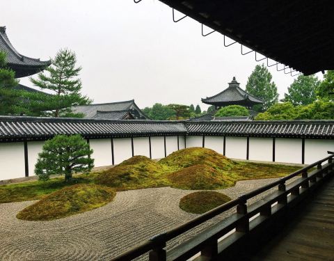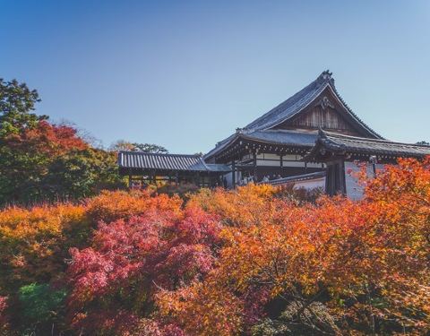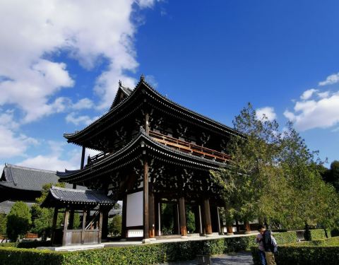 东福寺是京都规模较大的禅寺,临济宗东福寺派的总院。连年战争及1881年的火灾,将其佛堂、法堂、厨房、住房一并烧毁,其后逐次重建。 寺内的通天桥是观赏红叶的景区,卧云桥则是拍摄通天桥和洗玉涧红叶景观的好地点。全寺有25座塔,现存古老的山门是十分珍贵的文物。龙吟庵的国宝方丈则是现存十分古老的方丈建筑。方丈建于 1235年,于1890年重建。方丈四周围绕若干庭园,该布局是1939年由重森三玲先生(知名造园专家)所设计的。他希望借助当代艺术的抽象建筑手法表达镰仓时代朴实的禅道。