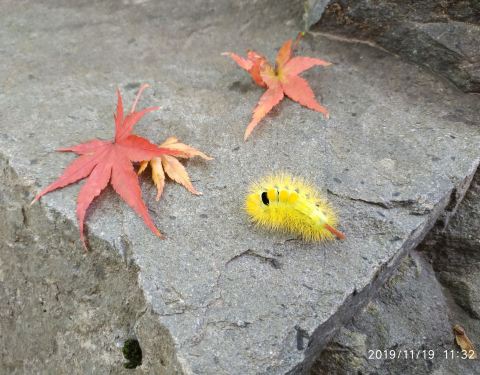 东福寺也是京都的赏枫圣地。从通天桥上向下看,大片的红叶,很壮观东福寺也是京都的赏枫圣地。东福寺的通天桥,是赏枫最棒的地方。从通天桥上向下看,大片的红叶,很壮观。还偶遇一只色彩艳丽的毛毛虫。