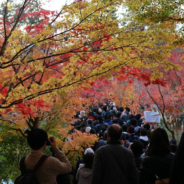 咳咳。红叶季在京都,你要记住的就是,想在人流密集的景点拍到没有游客的照片,就得靠往上挑着拍啊!先来看看真实的场景:稍微镜头视角往上挪就会好很多啦:在往上挪就不可能看到人了哈哈哈:好啦好啦,不搞笑啦,哈哈。上图上图!