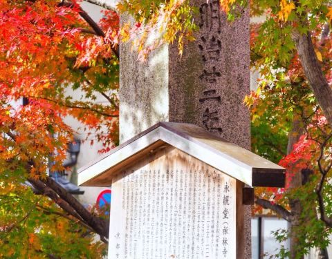 被称为永观堂的禅林寺 (永観堂),创立时的平安时代初期(853年)是真言宗的道场,亦是高僧的念佛之地。禅林寺 (永観堂) 因有严守戒律的高僧在此居住,名字也因此而来;自开寺至今不断举办慈善活动,是现今社会福祉活动的先驱者。 禅林寺 (永観堂)内保存着大量鎌仓时代前后的画像、典籍等,部分已被列为国定指定文化财产,其中山越阿弥陀图及金铜莲华文盘更被列为国宝,而永观堂所供奉的“阿弥陀”是鎌仓时代的作品,其特别之处是佛的头部是转向左边,与一般的佛像不同,类似的佛像只有四川出现过,实为罕有。永观堂也是赏红叶胜地,每年秋天都吸引游人前来拍照赏枫。