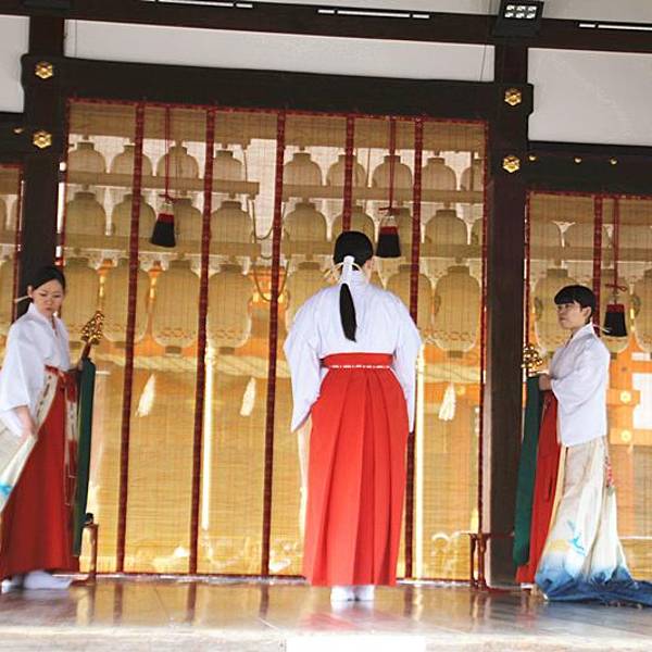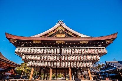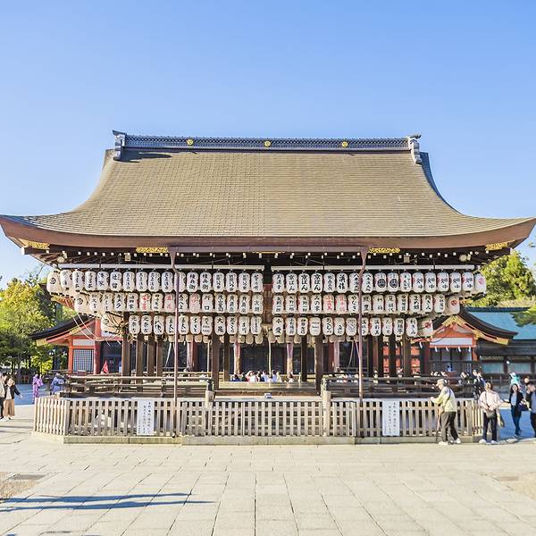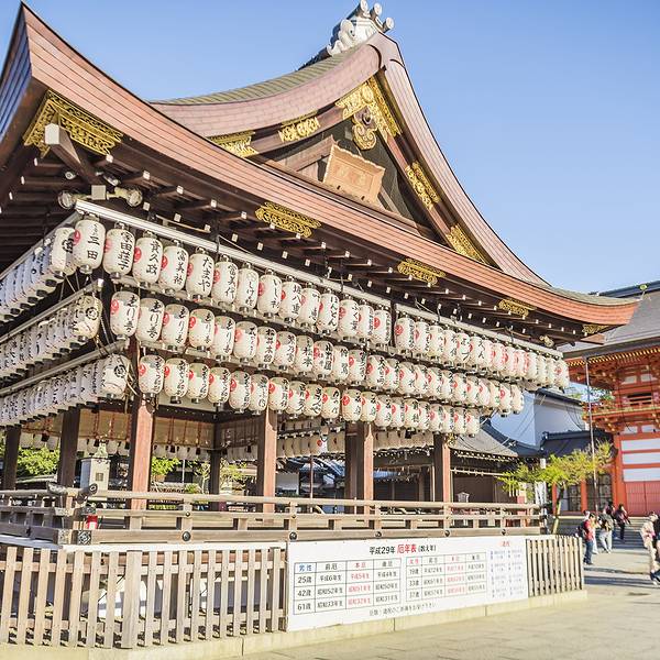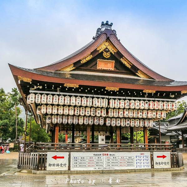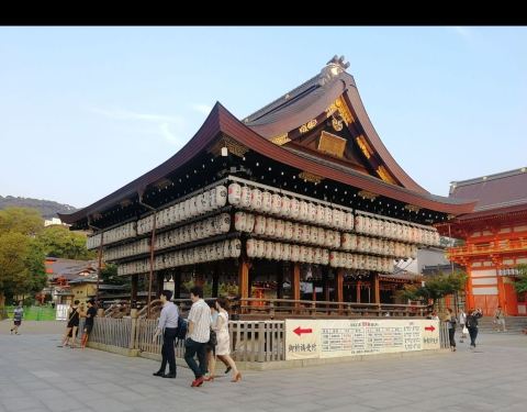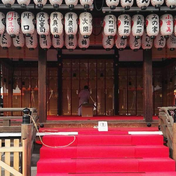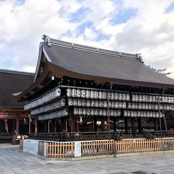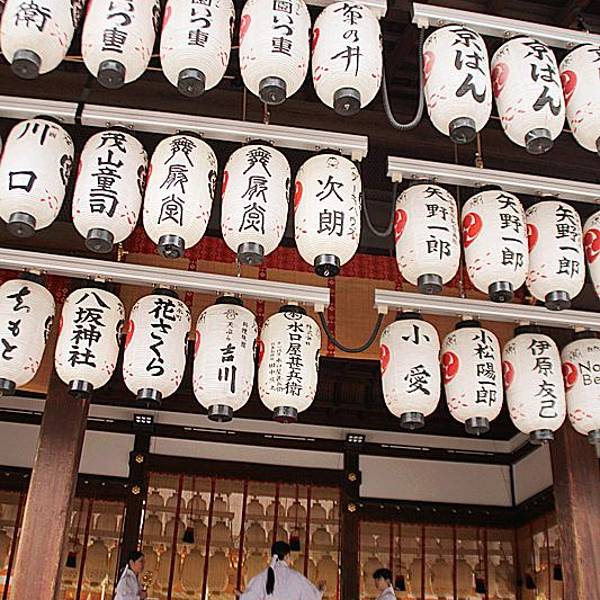 八坂神社香火鼎盛,深受商人喜爱。舞殿上无数的提灯,让它成为日本独特的神社建筑。来到神社中央的本殿前,有一座舞殿,是举行祭祀的舞台。