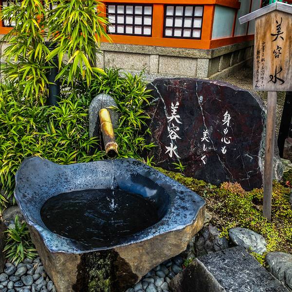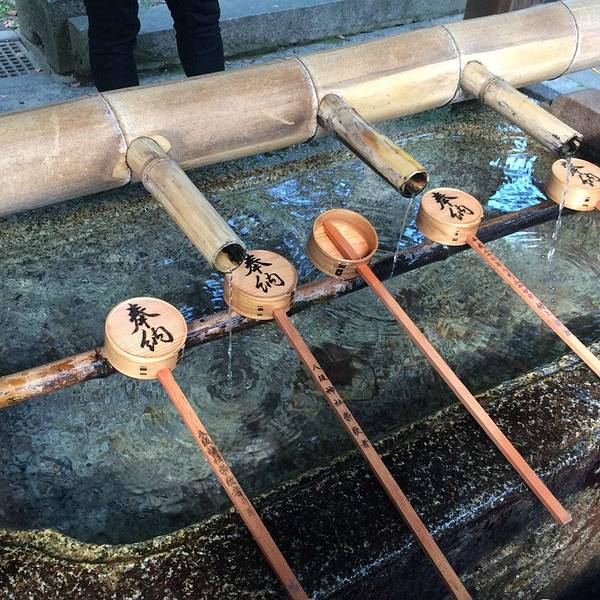 你会注意到舞殿的四周都挂满了提灯,上面写着不同赞助商的名称,保佑他们生意兴隆。在神社正殿的外面一般都有个手水舍,要注意这可不是喝水的地方,而是供人们在参拜神明之前净身心(洗手、漱口)用的。