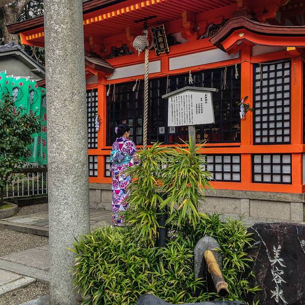 金骆驼 八坂神社其实也是一个很好的赏樱之地,里面有一大片的樱花园,但是我们来得不是时候,很多都还是光秃秃日本全国约有3000多座八坂神社,而位于京都祇园的是八坂神社的总本社,也被称为祇园神社,是京都香火最旺的神社之一。这里每年7月都会举行热闹非凡的祇园祭,与东京的神田祭、大阪的天神祭并称为“日本三大祭”。...日本全国约有3000多座八坂神社,而位于京都祇园的是八坂神社的总本社,也被称为祇园神社,是京都香火最旺的神社之一。这里每年7月都会举行热闹非凡的祇园祭,与东京的神田祭、大阪的天神祭并称为“日本三大祭”。整座神社,几乎都是以橙色作为主色调,这也是日本很多神社喜欢用的颜色,格外的耀眼。游客也很多,从大门进去,周围已经摆满了各种的小吃摊位,虽然味道不错,但是感觉总有点给神社掉分的感觉。在八坂神社里,很多地方都能看到小水池,专业名词我也不知道应该怎么称呼了,反正来到这里的游客都喜欢舀一点水,按照当地的习俗,用左手往右手上舀水,右手往左手上舀水,然后我就忘记了。。。一定要记住,水是不能喝的。神社大殿被称为“衹园造”,是日本独特的神社建筑,衹园造很大,建议多走走逛逛,其实往里面走深入一点还是比较安静的。八坂神社其实也是一个很好的赏樱之地,里面有一大片的樱花园,但是我们来得不是时候,很多都还是光秃秃的一片。不过如果是樱花季的时候来,也许看到的完全就不一样了。神社的舞殿上挂着无数的提灯,据说晚上开灯的时候会非常的漂亮,但我硬是一次没来,感觉有点浪费。而且据说,每年7月神社都会举行热闹的祇园祭,那时候还有许多吸引眼球的节庆装饰,我想那时候这里一定比樱花季还热闹。神社里还有专门求签、写绘马和请御守的地方,绘马图案非常多样,祈求恋爱的心形绘马是这里最受欢迎的,看来在哪里,求姻缘的都还是每个人最迫切的期望啊,啊哈哈哈。 展开