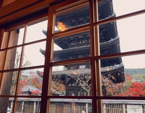 八坂塔也算京都东山的地标之一了,我们在酒店的宣传册里看到这张八坂塔的图片,佛系旅游的我们表示要去打个卡。八坂塔在二年坂三年坂这里,和那个榻榻米的星巴克离的挺近的。塔本身颜值一般,但和周围的红叶,日...
