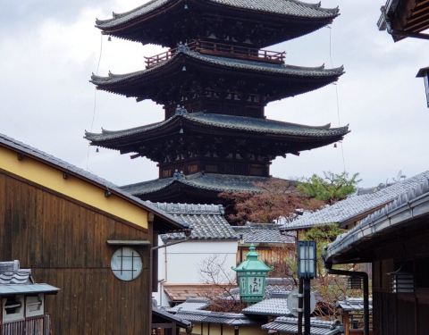 沿着清水寺的旅游图,走着走着就到这儿了。 这个塔还是挺有意思的,整个是五层结构,不像我国的塔是一层比一层小,日本的塔每层都差不多大。 可惜关门了,只能在外面看看。