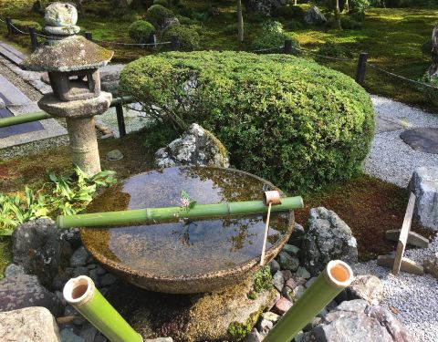 在诗仙堂附近,名气远没有诗仙堂大,顺着台阶上行,尽头,豁然开朗,名为“奔龙の庭”的枯山水很霸气地出现在眼前,一下子被震住。我和朋友都庆幸没有跳过这个不起眼的小寺庙。看到奔龙の庭第一眼,就想到了重森三玲,和重森三玲在龙吟庵作的庭颇有几分相似,但其实这个是21世纪的新庭,并不是他的作品。看来有些传承和模仿,但气势确是更胜一筹。寺院里的「十牛之庭」是欣赏红叶的名所,但去的时候还没到红叶季,倒是苔藓长得也不错。后面还有竹林可以走一走,还可以爬到高处看京都市区。