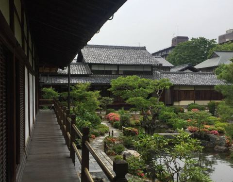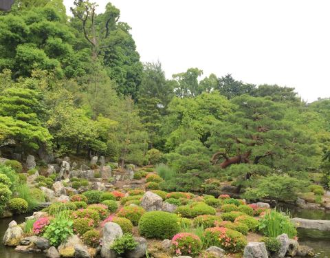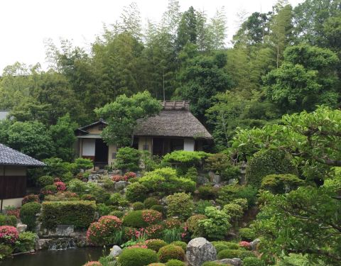 等持院依山而建,池泉回游式庭院,精致典雅,在郁郁葱葱的树林后面就是立命馆大学。
