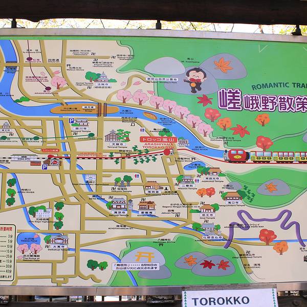 只是很多地方花都掉得差不多了,要是能提前个几天,是会被美翻天吧。看完地图转过身来就是御发神社了从站台走上来,就看到这张可爱画风的岚山地图啦。可以看出整个岚山地区被JR山阴本线(看板中间的那条白色黑色相间的像虚线的那条)划分为两个区域,上方为旅行团固定线路天龙寺、渡月桥等等,人流众多。而下方则...从站台走上来,就看到这张可爱画风的岚山地图啦。可以看出整个岚山地区被JR山阴本线(看板中间的那条白色黑色相间的像虚线的那条)划分为两个区域,上方为旅行团固定线路天龙寺、渡月桥等等,人流众多。而下方则是相对清静许多的岚山北侧,有常寂光寺、二尊院、化野念佛寺等等。 展开