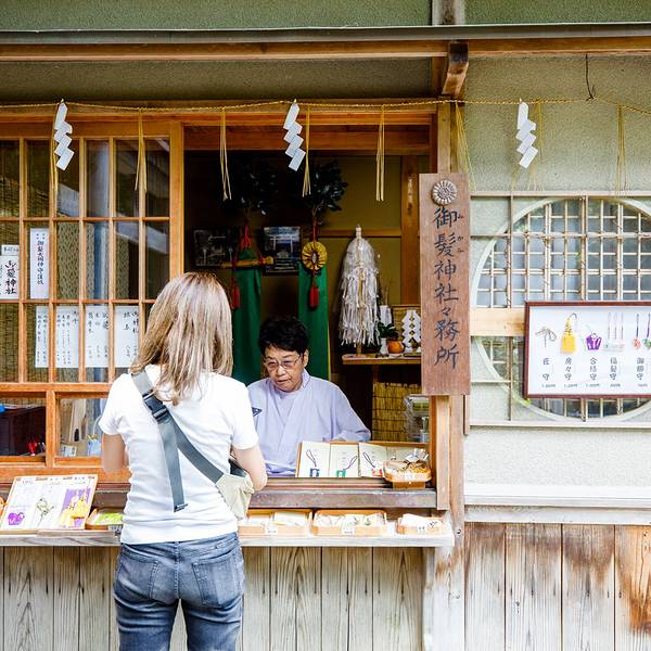 走到竹林小径的那一头,只稍稍往下拐一点,就是御发神社走到竹林小径的那一头,只稍稍往下拐一点,就是御发神社。相比竹林小径的密密麻麻的人群,御发神社像是闹市里的安静角落。顾名思义的这里就是护佑头发的神社,我说什么也亲自要求一个御守回去!
