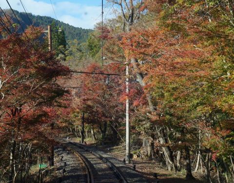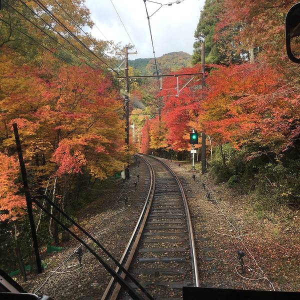 睿山电铁在市原站和二ノ瀬站之间的一段山路,秋天拥有无敌的红叶美景。