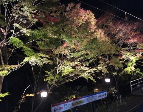在睿山电铁的市原站和二ノ瀬站之间的短短250米山路,也是红叶较为美丽的一段车程,红叶点灯期间的晚上,电车进入这一段区间,会放慢车速,乘客可以好好欣赏车窗外的红叶美景。睿山电车会有两种车型,一种是普通车厢,另一种是车身两侧都是大面积观景窗的展望列车“Kirara”,如果是赏红叶期间,强烈推荐乘坐展望列车。