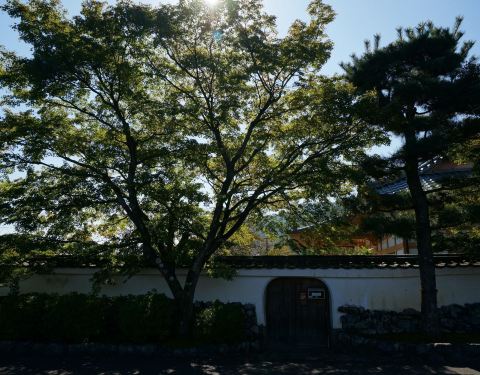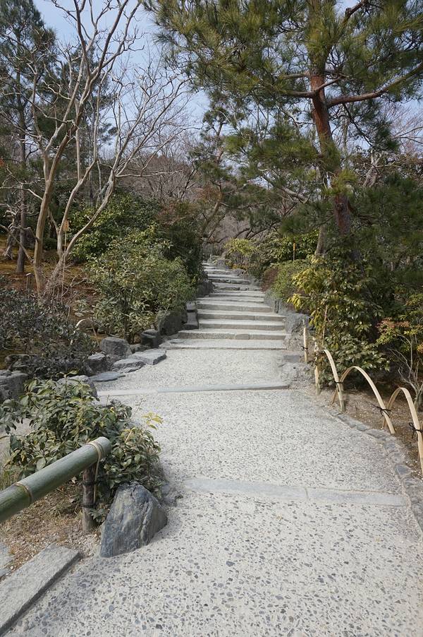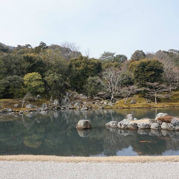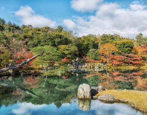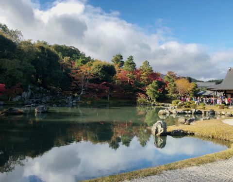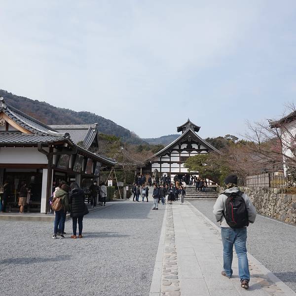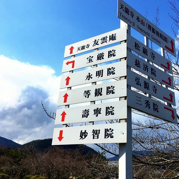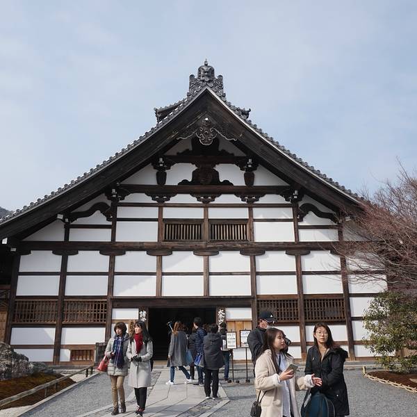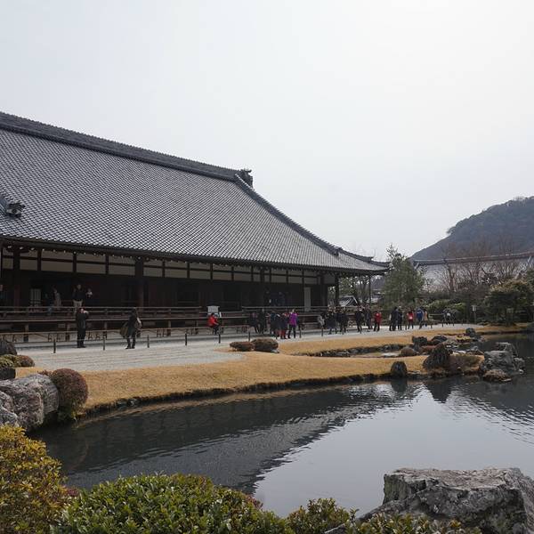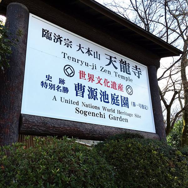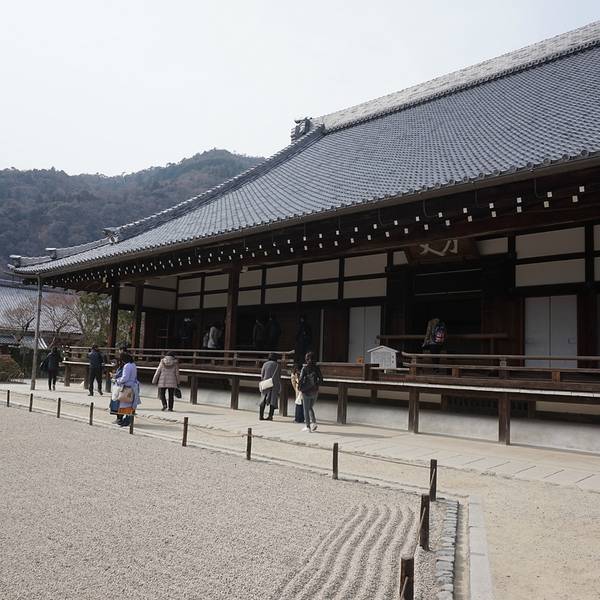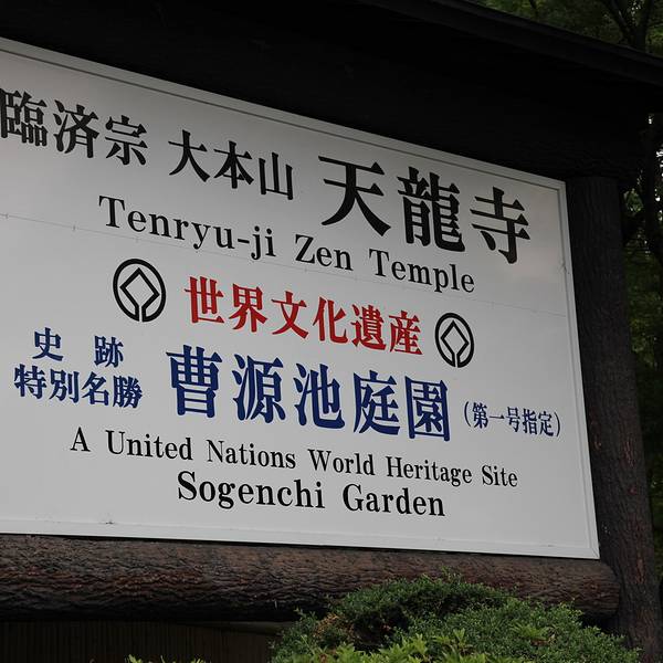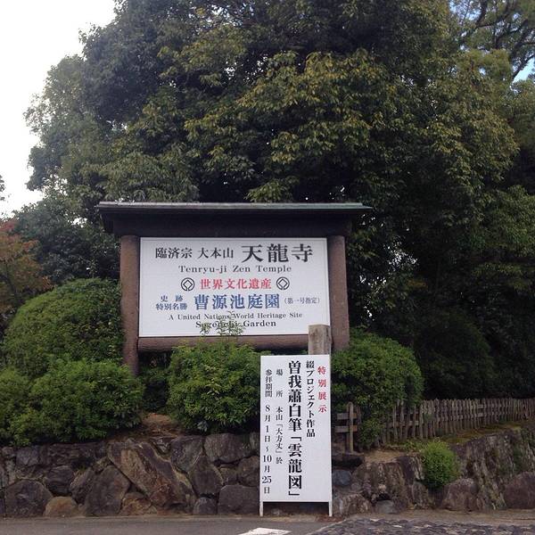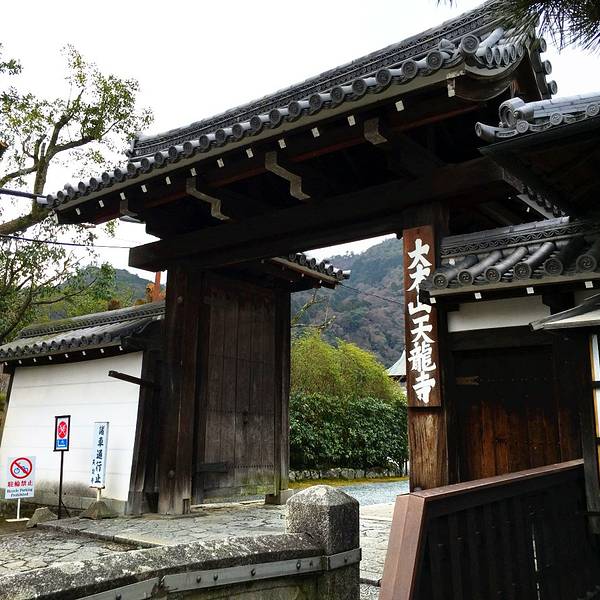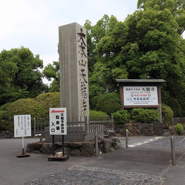 天龙寺建于1339年,为临济宗派天龙寺院派的总院,是足利尊氏将军为供养醍醐天皇而建的,在室町时代是京都五山的第一大山。天龙寺如今是岚山地区的世界文化遗产之一。 庭园借龟山和岚山之景,将贵族文化的优雅和禅宗的玄妙融为一体,是国家特别历史遗迹。寺内安放有藤原時代的释迦如来坐像。 天龙寺是一年四季都很有逛头的寺院,寺内的建筑繁多,包括东西向主轴线上的法堂殿、大方丈殿及曹源池庭園,轴线以南的禅堂、友云庵、龙门亭,和轴线以北的祥云阁、多宝殿、百花苑等。岚山竹林位于寺院的北面,如果先走竹林小径可以从寺院的北门进入。反之,可以从渡月桥进入岚山,从寺院正门进入,参观完毕后从北门出,接着走竹林小径,参观野宫神社。 百花苑 百花苑一年四季景致各不相同,可欣赏不同的花卉植物里有个名物。苑内有一名物便是“砚石”。明治32年(1899年)法堂重建时,画家铃木松年在法堂的天花板画了可以守护佛法的龙,也就是第二代云龙图,当时动用多达六十余位僧侣协助磨墨,砚石是为了纪念当时这些画家而设。据说拜访砚石可以让书法功力进步。 多宝殿 接着来到多宝殿,多宝殿里的祠堂供奉着后醍醐天皇的雕像,雕像的两侧则是历代天皇的牌位。殿前有两颗枝垂樱,春天时候粉红色花开非常美丽。多宝殿前“平和观音与爱之泉”,很多游客不能免俗会丢硬币许愿,所以池中青蛙面前的荷叶上满是硬币。 曹源池 走过一段坡路便来到了精华曹源池,曹源池庭園在700多年前由梦窗疎石设计,现为日本史迹特别名胜。这是池泉回游式庭园,可以绕着池子走一圈欣赏不同景致。曹源池的对岸,设置两块巨石所砌成的龙门瀑布,底下放置着鲤鱼石,有“鲤鱼跃龙”之意。整座曹源池借着后方的爱宕山、小仓山、龟山、岚山做背景,使曹源池看起来犹如巨型画作般精彩。池边各式树木、石头,倒映在池面上别有一番禅意,不止大器,庭园中一角一景都十分精致。 枯山水 大方丈和曹源池之间是一片整齐的枯山水,可以在这里细细感受日式庭院的美。库里是大方丈的入口,在这里记得欣赏一幅达摩图,是天龙寺的招牌。一、二代云龙图是大方丈的看点,只有遇到特别公开的时候才能一睹真容。法堂里有第三代云龙图,也只会在特别开放时候才能进入参观。