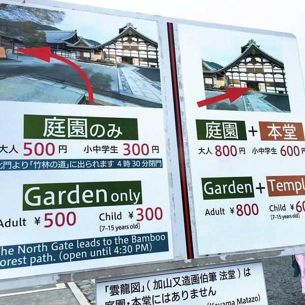 天龙寺里面的寺庙是100日币/人,庭院是500日币/人。坐京福、阪急电车在岚山站下车,进入岚山景区步行半个小时左右就到了。住宿建议会京都,这里离开市区比较远,而且景点比较集中,都在岚山风景区中,留个一天就可以了。