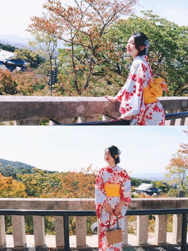 我去的时候正值初秋,就选择了适合秋天的红蓝色,带着类似🍁的花纹,腰带黄色有明显对比。