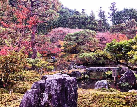 金骆驼 住宿强烈建议住在哲学之道上,特别小清新,而非常舒服,很有出来度假的感觉银阁寺只跟金阁寺差了一个字,但是却相差甚远。金阁寺是很多旅游团的必去之地,而且里面主要以寺庙为主,整个大气磅礴,银阁寺却有一种小家碧玉的气质,而且占地面积很小,但是更加多了一份禅意和宁静。我们最初...银阁寺只跟金阁寺差了一个字,但是却相差甚远。金阁寺是很多旅游团的必去之地,而且里面主要以寺庙为主,整个大气磅礴,银阁寺却有一种小家碧玉的气质,而且占地面积很小,但是更加多了一份禅意和宁静。我们最初的目的地是哲学之道,哲学之道是一条非常小清新的道路,而银阁寺就在道路的一端处,经日本朋友的介绍说它也是个景点,才顺道进去看了一下,不过非常值得,银阁寺很小,但是郁郁葱葱的全是树,我们去的时候正好是11月份,里面大部分的枫叶的颜色都变了,整个银阁寺被五颜六色包裹着,层林尽染。寺庙最有名的也就是这枯山水,典型的日本庭院,中间是一个清澈而浅的池塘,周围全是矮小的假山,池塘里还有很多金鱼,寺庙好像只会打扫垃圾,对于落下来的枫叶是不会管的,所有整个地面都被人染成了红色。寺庙内有个非常有名的沙地,沙地非常特别只要夏天过去,就会离奇的炎热,而冬天过去就会很舒服。银阁寺是一座依山而建的寺庙,只要爬上小山就能看完整个寺庙,寺庙的建筑物也就是非常古朴的日本建筑,但是爬上山看到的是一片绿色的苔藓,非常特别,因为寺庙周围都被参天大树包裹着,很少见到阳光,所有寺庙的屋顶全是苔藓,从山上往下看一片自然的颜色。