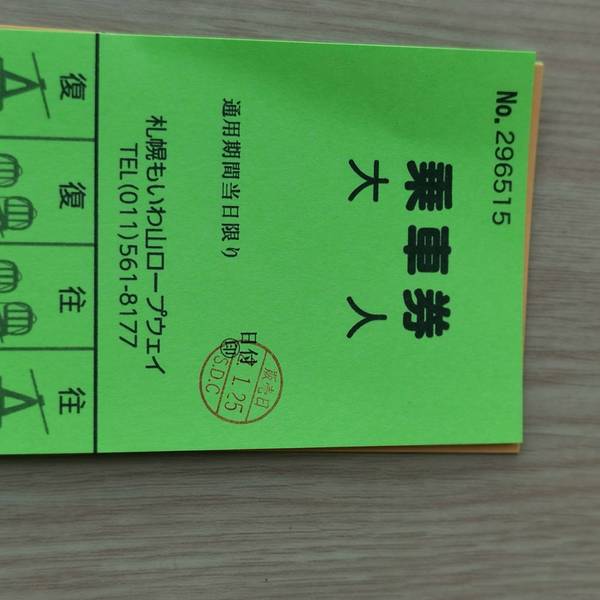 这种电车在路中间,特别窄小。刚好是周末,买个一日券比较划算只容1人站立,要小心呀电车来了我提前在Klook买了票,相对划算一点,兑换后就可以直接上山了。一次体验两种登山缆车藻岩山的缆车很有意思,全程分为两段。从山麓到半山腰为悬挂式索道(Ropeway),而从半山腰到山顶则是在轨道上滑行的Morisu迷你缆车(Mini Cable Car)。徒步登山除了乘坐缆车,藻岩山也可以轻松攀登,深受札幌市民的喜爱,可轻装登山的5条登山道
