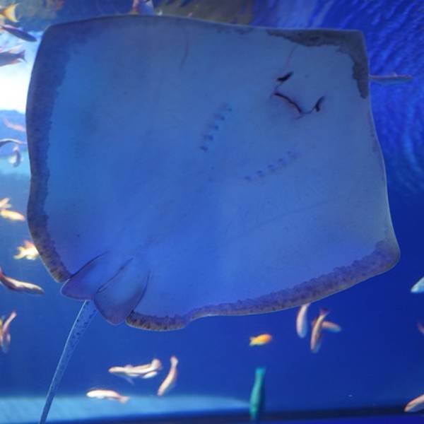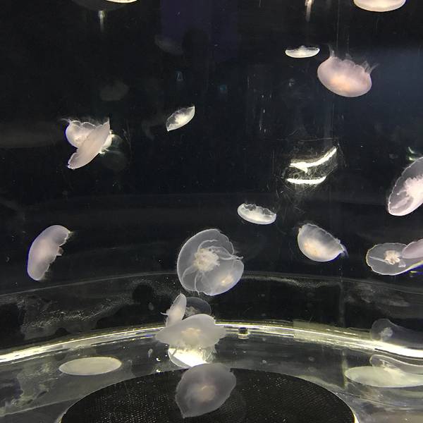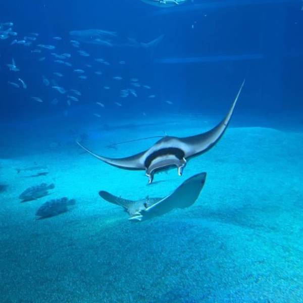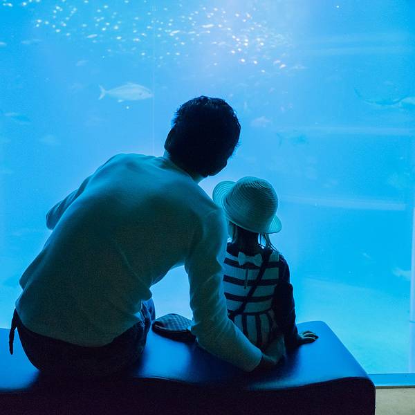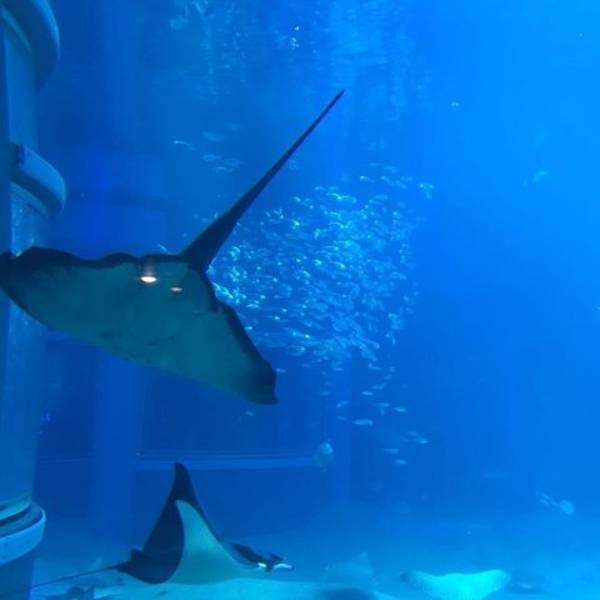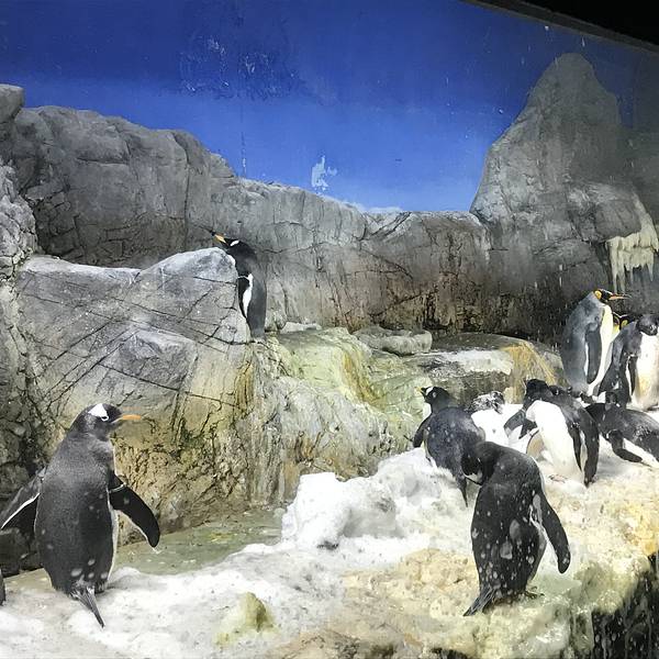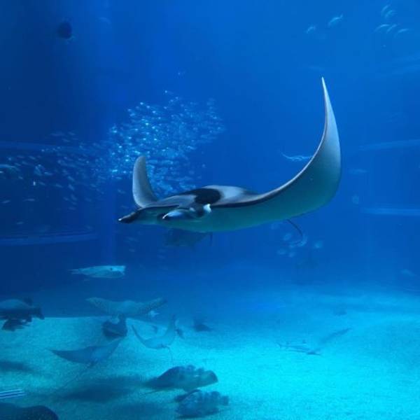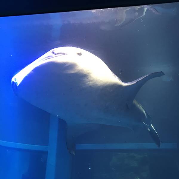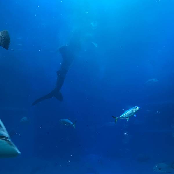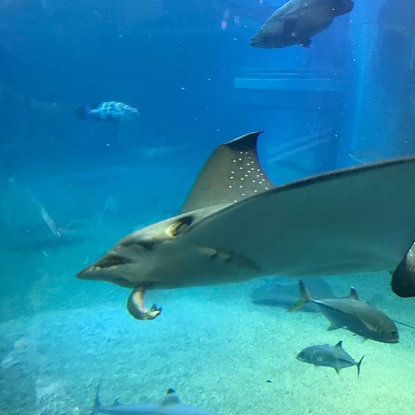 在水槽中央游弋着的就是海游馆的大明星鲸鲨,这可是世界上最大的鱼类哦。每一个观景窗前都有休息的座位,非常人性化的设计,看到有爱的一幕,一位爸爸正在指着这些海洋生物和女儿讲解,语气轻柔,讲得十分生动,乖巧的女儿听得也十分认真。被这些可爱的海洋小生物萌翻啦,赶忙用手机拍起了小视频,想记录下它们的一颦一动,心都随它们游进了海洋里。一直想和“笑脸鱼”蝠鲼来一次亲密接触,它们天生带着微笑,看起来像是个乐天派,在海里游得十分欢脱,速度也是杠杠滴,而且经常会在你不经意间游到你的面前来,在冉先森按了无数次快门后,终于捕捉到一张完整的亲密照。海游馆的内部设计非常棒,水箱够深动物有足够的活动空间,每一只动物都胖嘟嘟状态非常好,展示方式很好看的很清楚,整体下来体验感非常好。和其他海洋馆不同的是,海游馆里没有鲸鱼、海豚演出,但是冬季会有特别的企鹅散步活动。