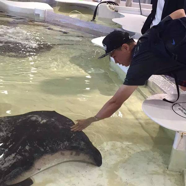 再往里走就要上一个特别高的电梯直接上到8楼,然后螺旋式的延坡道慢慢向下参观。后来才想明白整个海游馆应该就是一个大水罐。游客则是在水罐中穿行。出口处还有一个大池子,可以触摸各种鱼,比如魔鬼鱼什么的。但要注意摸过之后一定要及时洗手。最后是一面涂鸦墙,各种大人小孩画的不亦乐乎。