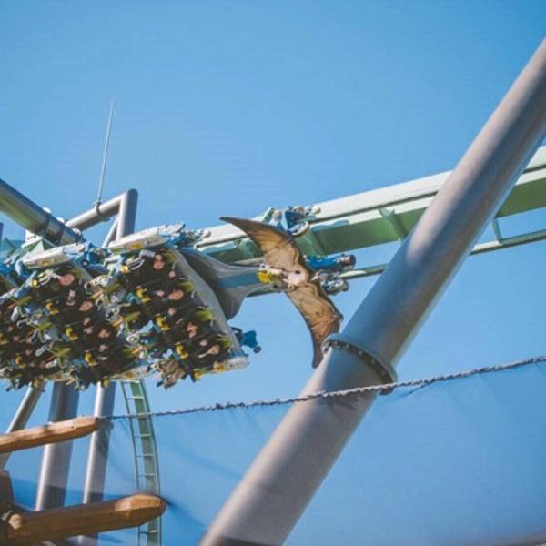 坐翼龙过山车给人的感觉是好像被翼龙抓住在天上飞一样,是我坐过的过山车里最刺激的一个,在天空中头朝下360旋转的感觉太刺激了,当时觉得受不了,但是过后想再玩一次。