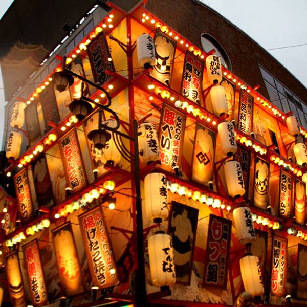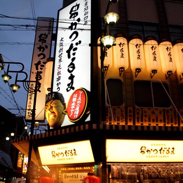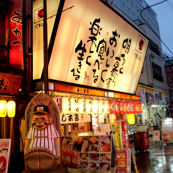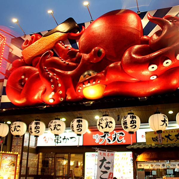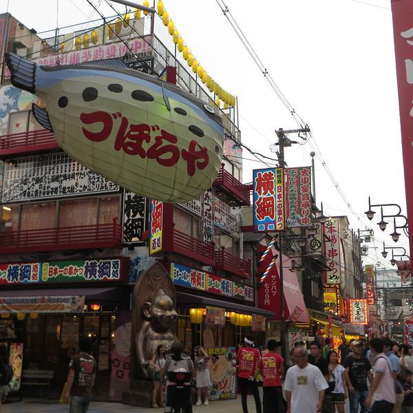3.品尝种类丰富的名小吃炸串,还有章鱼烧、河豚料理等地道美味。