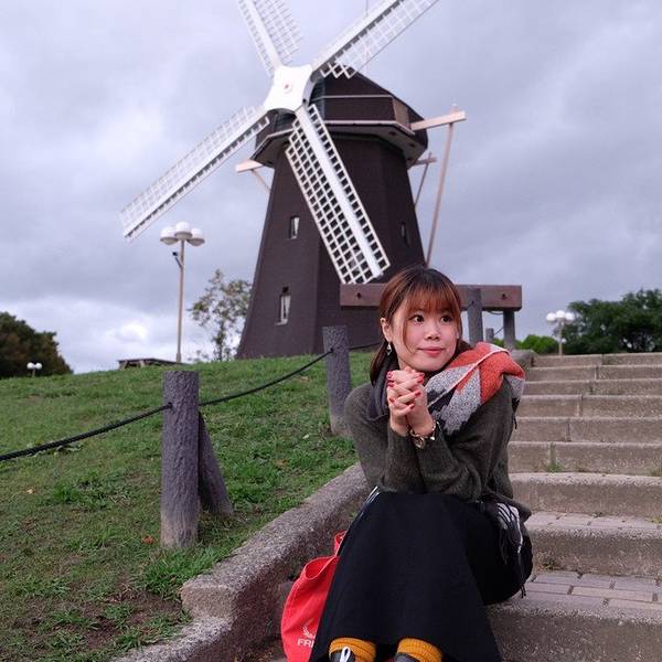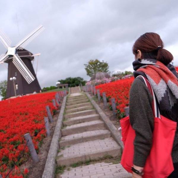该绿地占地106公顷,在花博纪念公园内,拥有一个巨大的水池,山坡上的郁金香、鼠尾草、大波斯菊还有其它各类花卉一年四季绽放着,风车是公园的象征,还有一个玫瑰园,里面有2600株、近450个品种的玫瑰。在这里还可以看到各种昆虫、数千只鸭子和近100种野生鸟类。另外,在流淌着小溪的绿地上有可供孩子们玩耍的操场、一个可供露营和烧烤的地方,甚至还有骑马场、四季开放的游泳池和一个运动中心。1990年在鹤见绿地曾举办过`90国际花与绿博览会。博览会之后,这个地方便成了一年四季鲜花盛开的纪念公园 ——————摘自《百度百科》 去这里还是蛮方便的,地方呢……还算大,不过因为已经入秋又有台风气候的影响,到达的时候天已经擦黑了…… 出了地铁就看到这拿着花的孩纸……怎么那么像脚踩风火轮手拿乾坤圈的哪吒呢……你应该拿莲花啊……