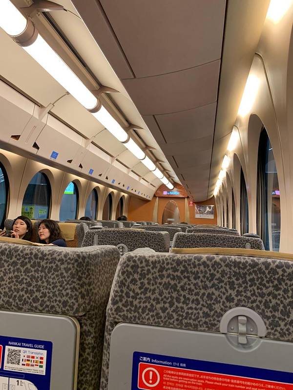 到达大阪机场,要坐摆渡车才能到航站楼。通往大阪市区的南海列车,有普通版和专列,我们坐的是专列,有固定座位,车票某宝有售。南海列车内部,相当敞亮。